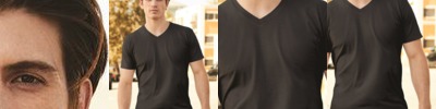 • Fashionable mitered-V rib collar with shoulder-to-shoulder taping
