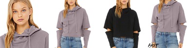 8 oz., 52% airlume combed and ringspun cotton, 48% polyester fleece, 32 singles; Edgy addition to any wardrobe; Super-soft sponge fleece best seller; Sporty crossover hood; Dyed-to-match drawcords; Semi cropped body; Cut-out elbow detailing; Side-seamed; Tear away label;